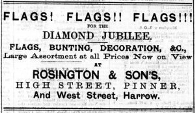 Only a couple of other Diamond Jubilee advertisements existed in Harrow newspapers: one for J. Wright Cooper from the High Street, Harrow-on-the-Hill (who interestingly enough supplied buns and cake for the Diamond Jubilee Celebrations put on at Harrow Recreation Ground); and one for Rogers & Co., who could supply all the lights you needed for your jubilee celebrations.
